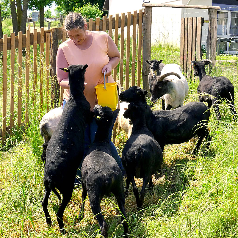 Schafe und Hühner halten wir überwiegend aus Tierarten, die vom Aussterben bedroht sind. Auf diese Weise erbringen wir einen wichtigen Beitrag zur Arterhaltung und zur Bewahrung der Schöpfung.