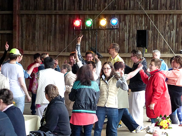 Eine Jubiläumsfete für und mit den Beschäftigten der Werkstatt - Am Abend des 30. April lockte diese Einladung der Werkstatt anlässlich des 25jährigen Jubiläums rund 120 Beschäftigte in die Scheune des Bauernhofes. Hier war alles für Essen und Feiern vorbereitet und DJ Kalle sorgte zusätzlich für gute Stimmung.