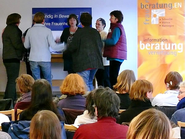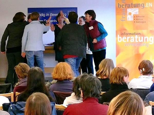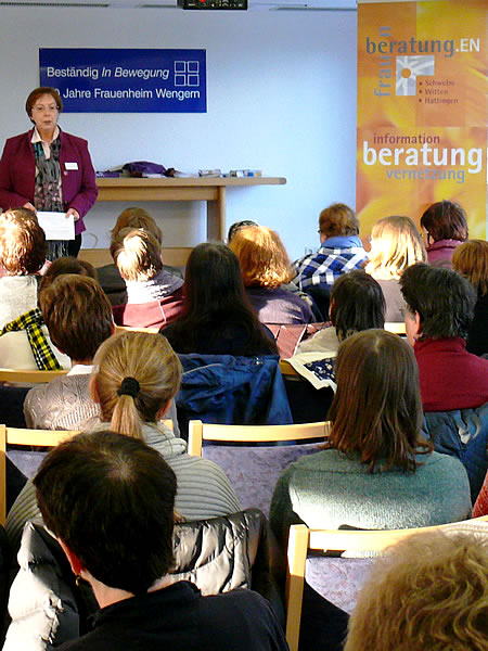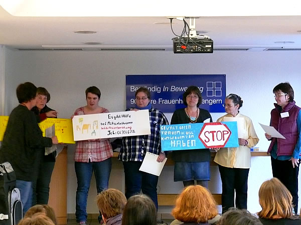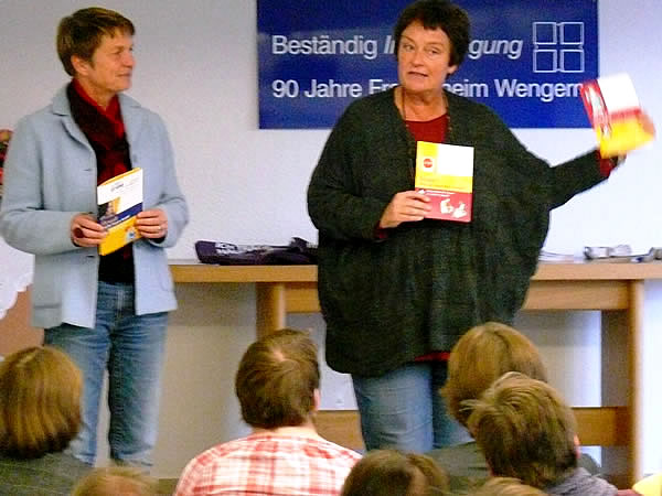 Marion Steffens und Andrea Stolte (GESINE-Netzwerk Gesundheit.EN - Intervention gegen Häusliche Gewalt) stellten in der Veranstaltung auch ihre dritte Broschüre in leichter Sprache mit dem Titel „Gewalt macht Frauen krank!“ vor. Annika Nietzio, Büro für Leichte Sprache, übersetzte diese Informationen für Frauen. Ihren Entwurf hatte die Zeitungsgruppe „Regenbogen“ des Frauenheims auf Verständlichkeit gegengelesen. Diese Broschüre „tut vielen gut“, so Andrea Stolte bei der Präsentation.