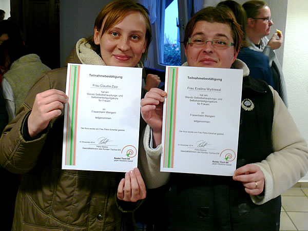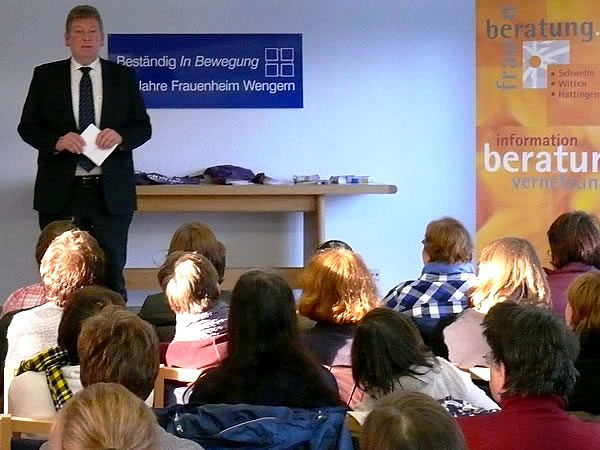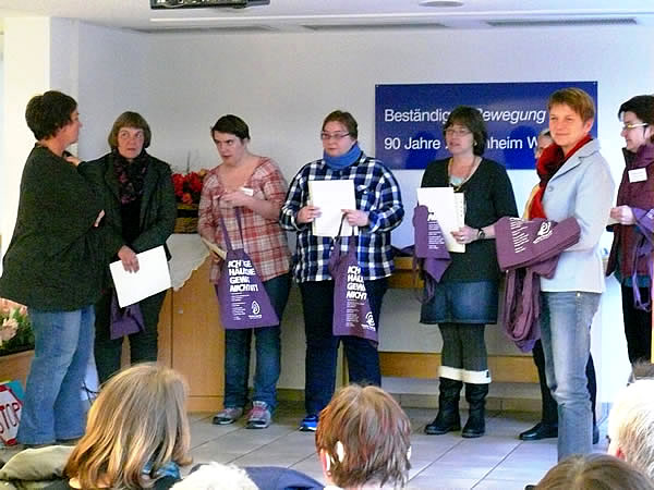 Petra Bedow, Geschäftsführerin des Runden Tisches EN gegen häusliche Gewalt, überreichte im Anschluss an die Präsentation eine Stofftasche mit der Aufschrift „Ich trage häusliche Gewalt nicht mit“ und Zertifikate über die Teilnahme an dem Gesprächskreis und an dem Wendo-Kurs. Bei beiden Gruppen beteiligt sich der Runde Tisch an den Kosten. Bürgermeister Frank Hasenberg zeigte in seinem Grußwort u.a. die Bedeutung des gemeinsamen Engagements der Frauengruppe „Mutig und stark“, der Frauenberatung EN und das des Frauenheims auf. Dieses Engagement habe wichtige Impulse für die Umsetzung der UN-Behindertenrechtskonvention in der Stadt Wetter und für eine „menschengerechte Stadt Wetter“ gegeben.