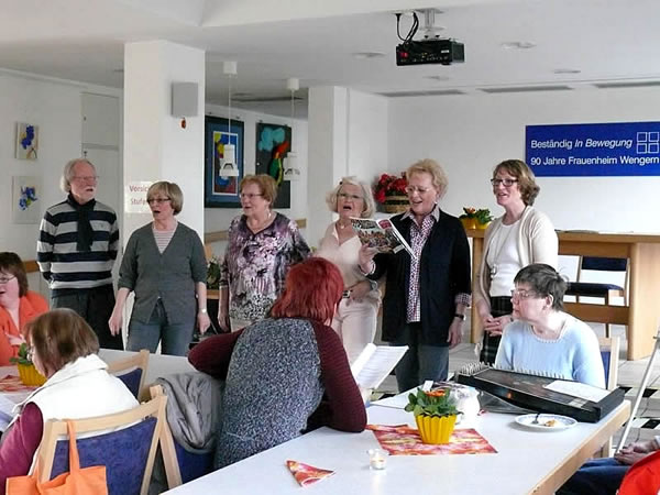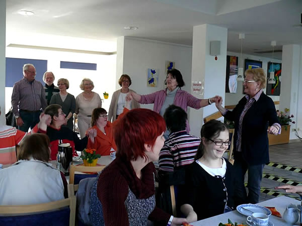 Der frisch gegründete gemischte Chor u.a. mit Magdalene Dierkes-Alperstädt und Sabine Mayweg sorgte mit seinem Lied „Auf der Mauer, auf der Lauer..“ für Stimmung im Saal. Der Sketch „Im Reisebüro“ beendete den gemütlichen Nachmittag und sorgte noch abends in einzelnen Wohngruppen für Diskussionen zu Urlaubswünschen in Nah und Fern.