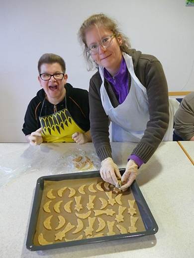 Ausgestattet mit allerlei Backzutaten, Backrolle und Ausstechformen ging es tatkräftig ans Werk. Mit Liebe zum Detail und in gemeinschaftlicher Zusammenarbeit kamen Butterplätzchen, Ingwer-Schoko-Plätzchen, Haferflockenkekse, Makronen und andere Leckereien zustande.
