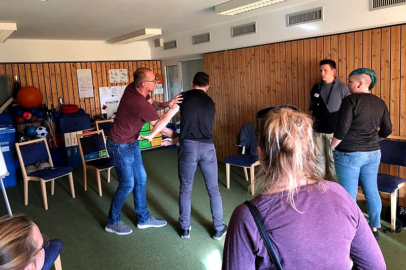 Die beiden Referenten beeindruckten durch ihre Breite an Kompetenzen: Dirk Schöwe ist Systemischer Sozialtherapeut, Psychomotoriker und Systemischer Supervisor. Gunnar Preuß ist SoK-Trainer & SAM Mentor des Instituts für systematisches Aggressions-Managment und Mitentwickler des Konzeptes „Schützen ohne Kämpfen“ sowie Kampfsportlehrer (Judo Inyo Ryu), Kurs- und Gesundheitstrainer an der Universität Rostock und diversen Einrichtungen.