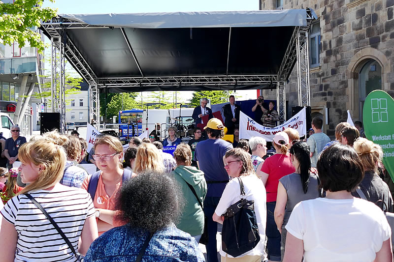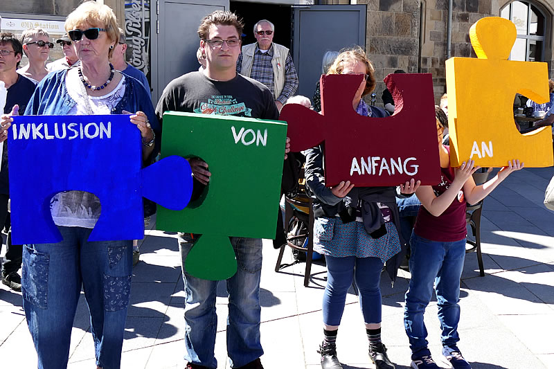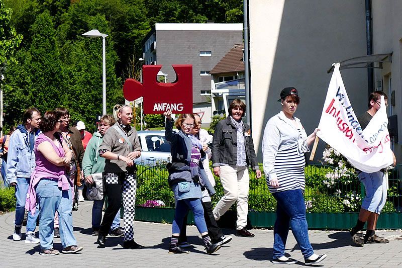 Ca. 200 Menschen beteiligten sich am Sternmarsch und trafen sich auf dem Bahnhofsvorplatz. Bewohnerinnen, Bewohner des Frauenheims, Klientinnen, Klienten des ambulanten Dienstes NAOMI, Angehörige und Ehrenamtliche marschierten in Gruppen von 40 bzw. 20 Personen von der Shell-Tankstelle und vom Haus Schöntal los. Voller Stolz trugen sie die Transparente mit der Aufschrift: „Wir finden zusammen - Inklusion von Anfang an“ vor sich her. Dem Marsch schlossen sich Bewohnerinnen der Evangelischen Stiftung Volmarstein und andere Wetteraner Bürgerinnen und Bürger an.