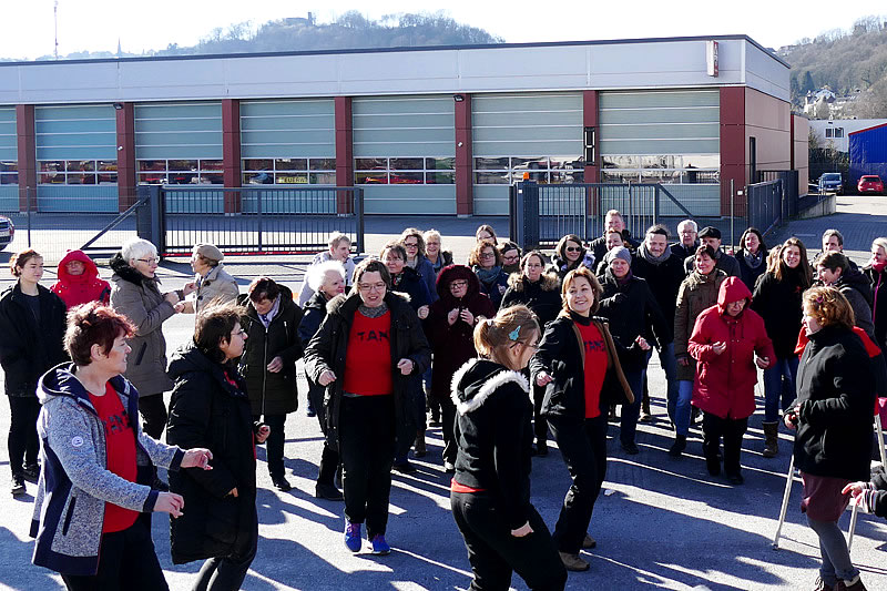 Unterstützen ließen sich die Frauenbeauftragten von dem Tanztheater TANZ. Zu diesem gehören Claudia Kockskämper, Katharina Kroll, Saskia Singh, Astrid Tremblau und Claudia Zipp, angeleitet von Ilona Korge-Niehaus. TANZ empfindet in einfach nachzuahmenden Bewegungen und Figuren das Lied „Sprengt die Ketten“ nach. Das Tanztheater tanzte vor und alle tanzten dann mit Begeisterung mit.