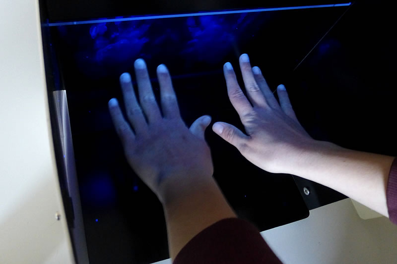 Nach dem Einreiben der Hände mit dem Gel wurden die Hände in die Derma LiteCheck Box gehalten. Und siehe da: mancher Daumen, manches Nagelbett outete sich als „noch dreckig“. Und so wurden die Regeln für das Händewaschen wiederholt und voller Enthusiasmus trainiert.