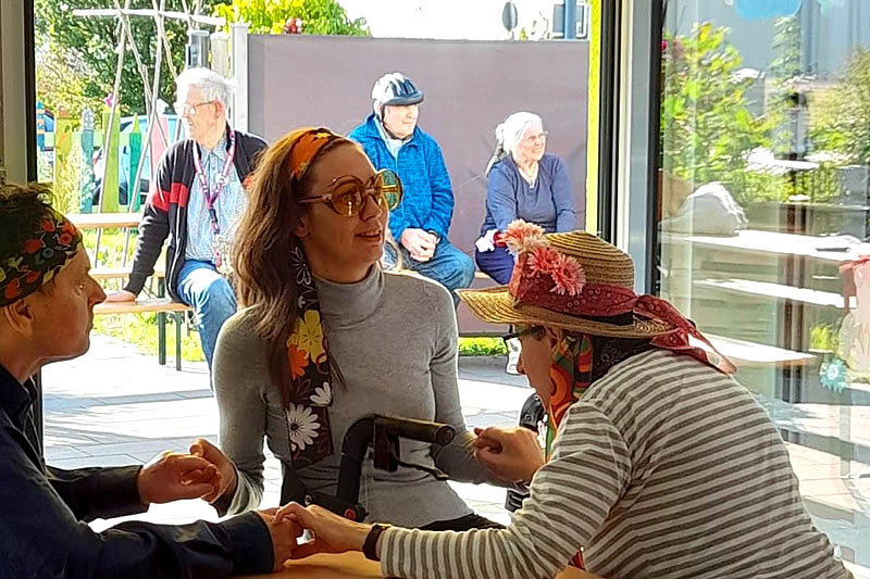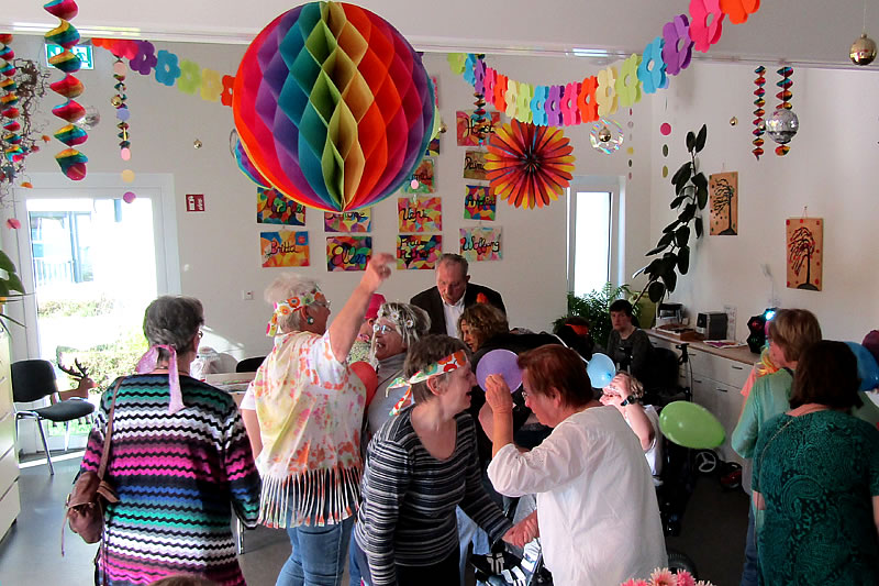 Eine Woche später hatten die Bewohner*innen und Mitarbeiter*innen des Haus Schöntal mit dem Wetter mehr Glück. Bei Sonnenschein, wiederum leckerem Essen, Spiel mit viel Spaß war es eine „wunderbare Party im siebziger Jahre Stil - als wir alle jung waren.“