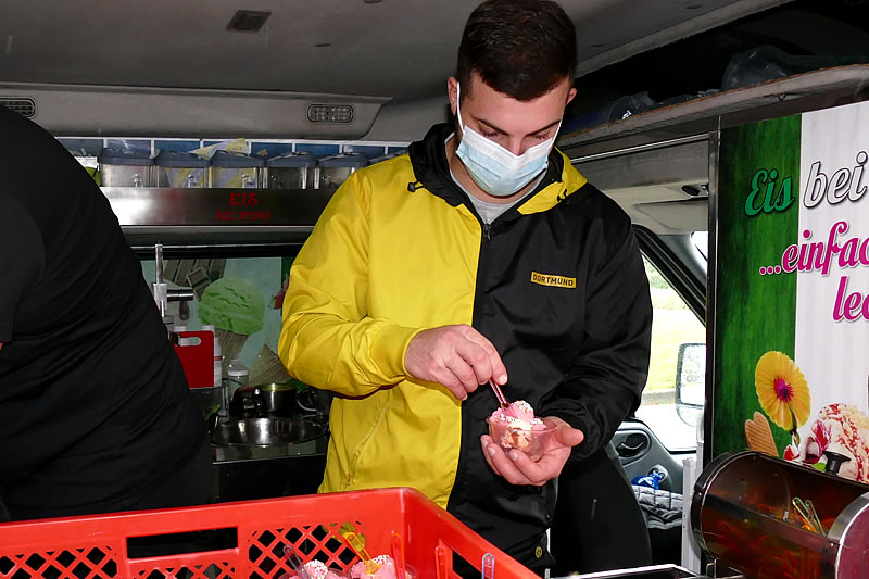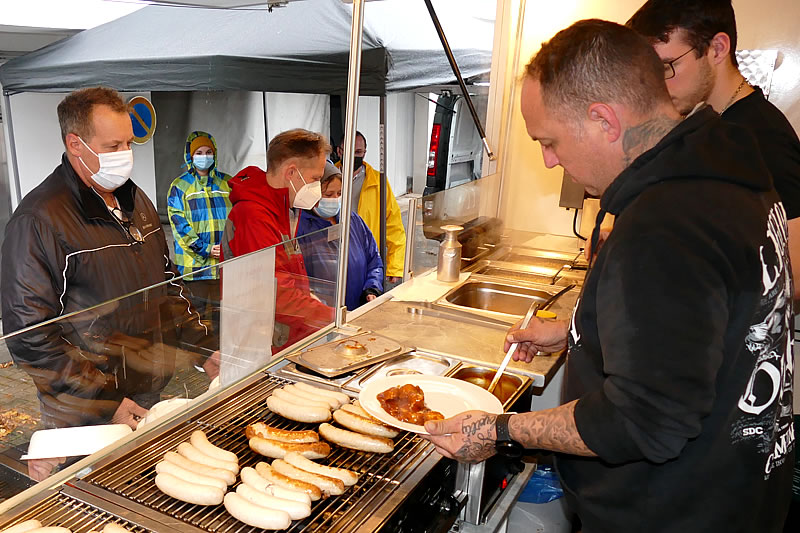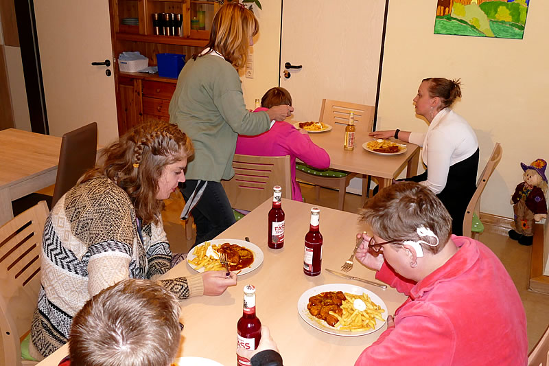 Aufgrund des Dauerregens mit Sturmböen wurde das Wunschmenue „Curry-Wurst mit Pommes“ und anschließend „italienisches Eis“ –portionsweise frisch am Bratwurst-Wagen zubereitet und ebenso wie das Eis vom Eiswagen von Mitarbeiter*innen auf die Gruppen am Böllberg bzw. in die Speiseräume in der Nordstraße gebracht. „Toll, schmeckt klasse, alles frisch und warm!“ war das Urteil. „Natürlich hätten wir uns lieber sich am Curry-Wurst-Wagen und am Eiswagen angestellt, aber – unabhängig von den AHA-Regeln – bei dem Wetter nicht!“ Nach dem Essen kam das Unterhaltungsprogramm - traditionell Karaoke, Tanzen oder Gesellschaftsspiele.