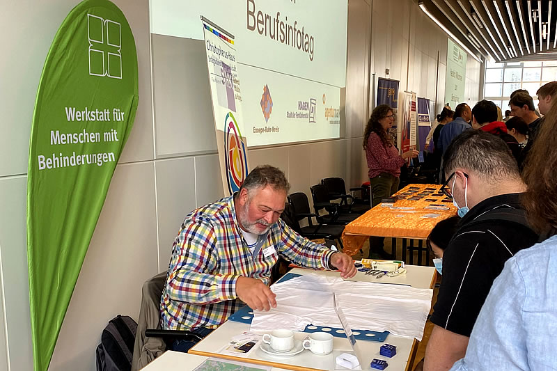 Über 300 Schüler*innen nutzten den Vormittag zu Gesprächen und zur Klärung von Fragestellungen rund um berufliche Bildung und Arbeitsmöglichkeiten. Geduldig beantworteten Viktoria Wienholz (QM-Beauftragte BBB) und Axel Rainero (Sozialer Dienst WfbM ) am Infostand der WfbM viele Fragen. Darüber hinaus konnten sich die Schüler*innen auch an einem exemplarischen Arbeitsplatz aus der Wäscherei ausprobieren.