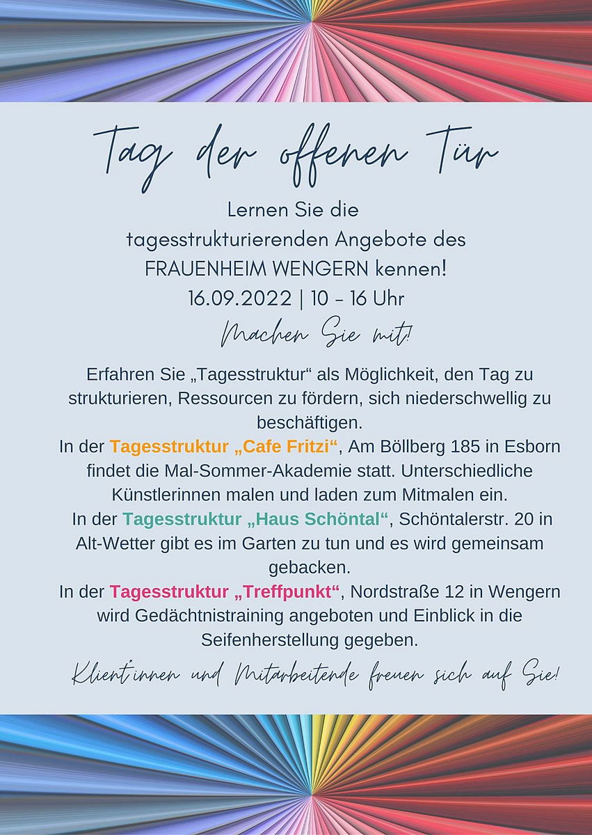 „Wir müssen doch ´mal wieder unsere Freunde einladen und ihnen zeigen, was wir so den ganzen Tag in der Tagesstruktur machen,“ hieß es. Gesagt, getan. So bereiteten die Frauen und Männer in den Tagesstrukturen ‚Cafe Fritzi‘ in Esborn, ‚Haus Schöntal‘ in Alt-Wetter und ‚Treffpunkt‘ in Wengern Mitte September Mit-Mach-Angebote für die Nachbarschaft, gesetzliche Betreuer*innen, Angehörige und Mitarbeitende anderer Dienste vor.