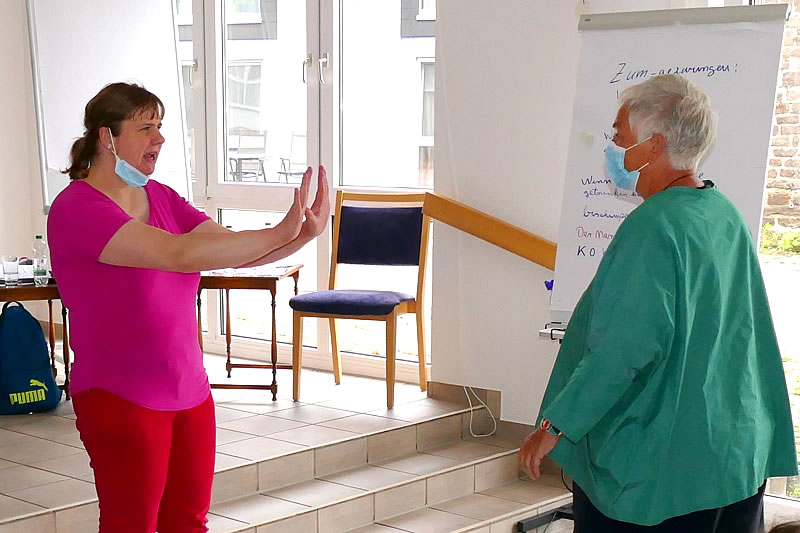 „Auf dem Weg zu einem selbstständigen und selbstbestimmten und vor allen Dingen gewaltfreien Leben wollen wir die Frauen unterstützen“, erklären die Frauenbeauftragten „Sie trainieren Selbstbehauptung, Selbstverteidigung. Sie lernen Handwerkszeug, Techniken und Strategien, um sich gegen Grenzüberschreitungen wehren zu können. Diese Grenzüberschreitungen reichen von „blöden Sprüchen“, unangenehmen Blicken, unerwünschten Berührungen bis hin zur massiver Gewalt. Die ersten Schritte sind Nein-Sagen und Selbstsicher-Auftreten.“