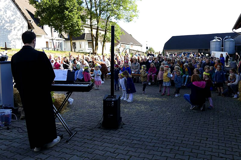 Nach dem Gottesdienst sorgte der Förderverein der Kita für ein buntes Kinderprogramm, die Landfrauen teilten Suppe, Kuchen und Kaffee aus und inmitten des Geschehens und zur Freude aller gab es einen riesigen Heuhaufen: Dort waren besonders viele Kinder, denn dort waren Äpfel und Bonbons versteckt!