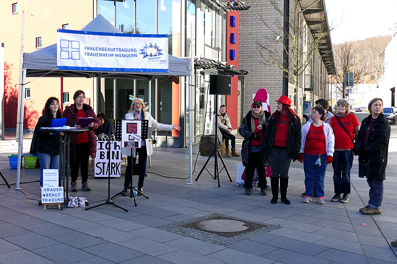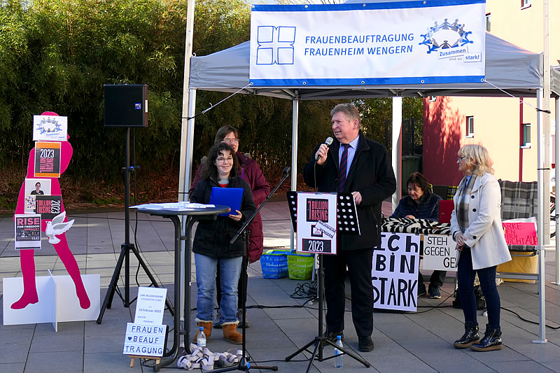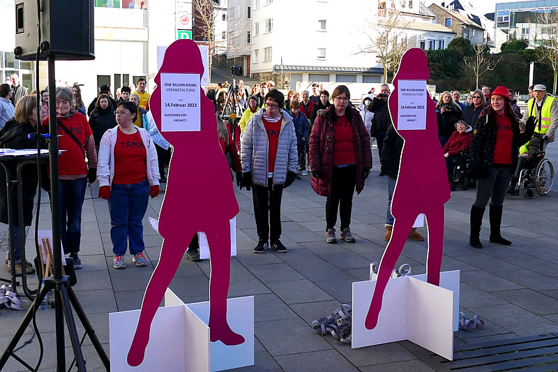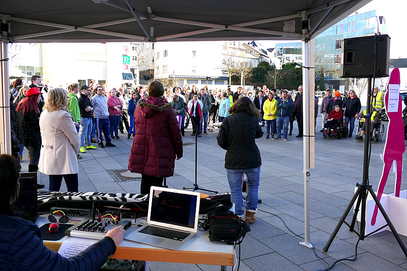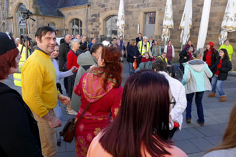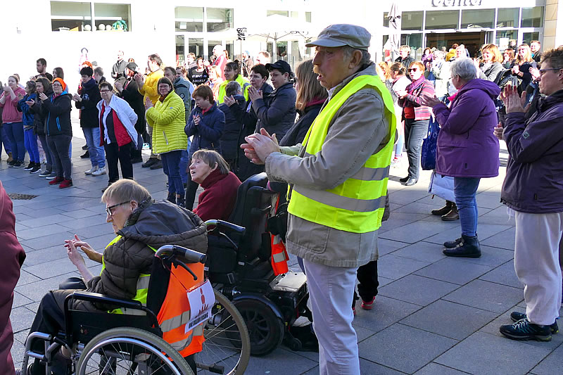 Seite an Seite tanzten der Bürgermeister und der Behindertenbeauftragte mit den protestierenden Frauen. Nach den Video-Botschaften im Internet zu Zeiten der Pandemie luden die Frauenbeauftragten jetzt wieder zu einer Präsenzveranstaltung ein. Mitten in Wetter auf dem Bahnhofsvorplatz veranstalteten dieses Jahr die Frauenbeauftragten der WfbM – Astrid Tremblau und Svenja Müller – die Aktion zu One Billion Rising (englisch: Eine Milliarde erhebt sich).