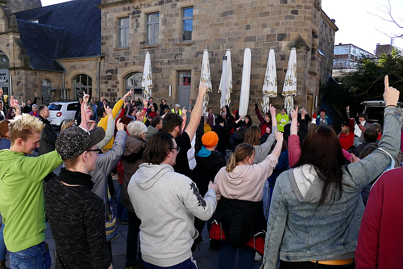 Um die 100 Personen tanzten bei strahlendem Sonnenschein. Zu den Frauen und Männern, die sich schon immer gegen Gewalt engagierten, „erhoben sich für die Freiheit“ Passant*innen vom Busbahnhof, aus den naheliegenden Geschäften und die MdL Kirsten Stich. Nach den Ansprachen der Frauenbeauftragten und der Rede des Bürgermeisters Frank Hasenberg animierte die Tanzgruppe „Tanz“ unter der Leitung von Ilona Korge-Niehaus zum Mittanzen. Zum Abschluss stimmten alle in Heinrich Heines Lied „Die Gedanken sind frei“ ein.