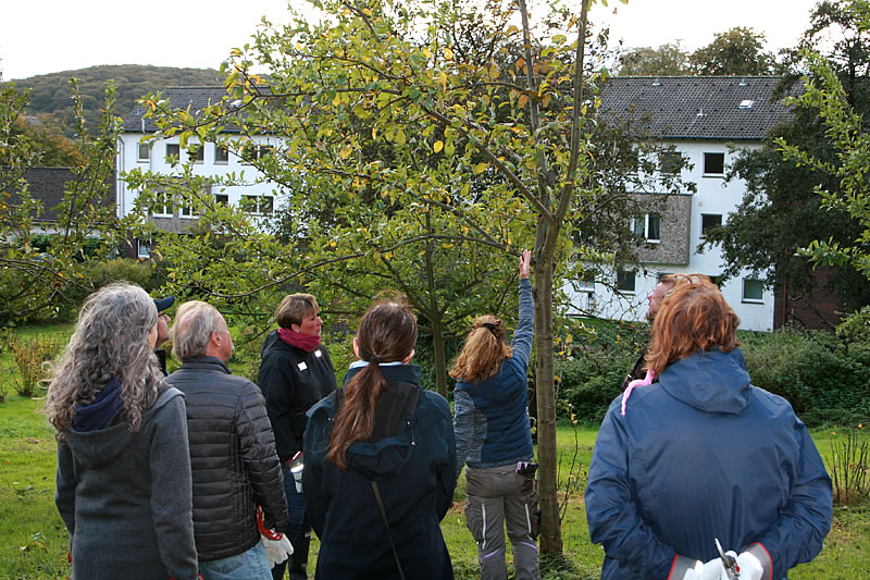 Nachbar*innen, Mitarbeiter*innen und Interessierte kamen Ende Oktober ins FRAUENHEIM WENGERN. Sie alle wollten bei einer kostenlosen Veranstaltung mehr über den Obstbaumschnitt erfahren. Sonja Breuker, Mitarbeiterin im Bereich „Garten“, teilte mit allen die Leidenschaft zum Gärtnern.
