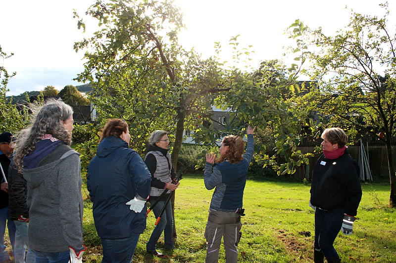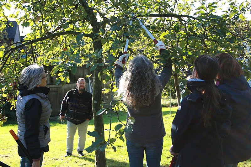 Zur Begrüßung gab es erst einmal den hofeigenen Apfelsaft. Sonja Breuker begann zunächst mit der Theorie. Dann konnten alle individuelle Fragen stellen rund um den richtigen Schnitt am Obstbaum. Beim Gang zu verschiedenen Bäumen unterschiedlicher Altersklassen bekamen die Teilnehmenden dann praktische Schnittvorführungen.