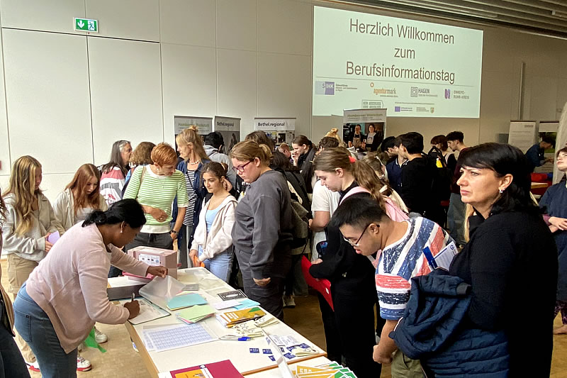 „Zum Berufsinfotag für Schülerinnen und Schüler mit Unterstützungsbedarf gibt es – wie auch in den letzten beiden Jahren - nur Positives zu berichten!“, waren sich die Mitarbeitenden der Werkstatt für Menschen mit Behinderungen (WfbM) des FRAUENHEIM WENGERN einig. Mitte September fand er im großen Saal der SIHK zu Hagen statt.