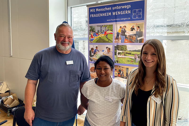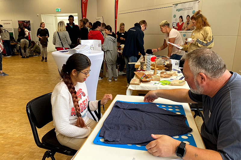 Bei dieser Messe beantworteten Viktoria Wienholz (Qualitätsbeauftragte Berufsbildung), Patricia Weigang und Axel Rainero vom Sozialen Dienst viele Fragen am WfbM-Stand des FRAUENHEIM WENGERN. Zudem begleiteten sie das Mitmachangebot: Die Schüler*innen an einem exemplarischen Arbeitsplatz der Wäscherei ausprobieren, indem sie nach der Leittext-Methode (QE) mit Hilfe eines Faltbretts Oberbekleidung schrankfertig falten konnten.