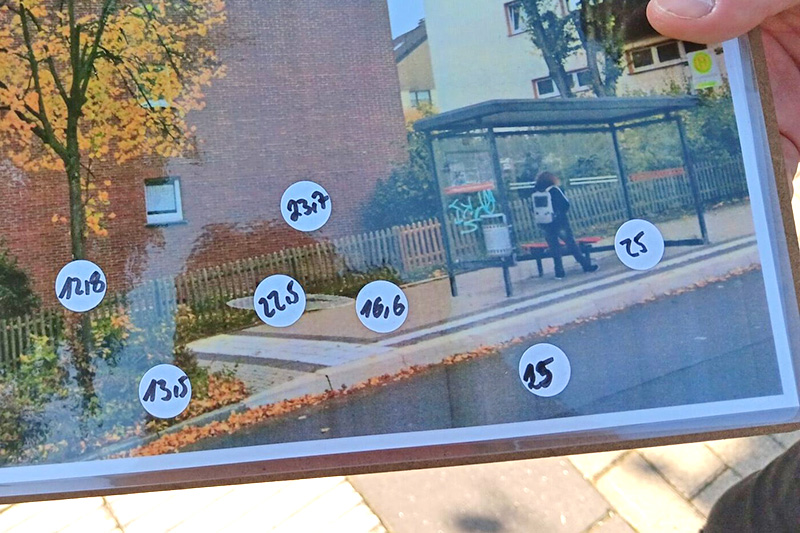Im Rahmen des Hitzespaziergangs wurden die Teilnehmenden mit Thermometern ausgestattet, um an verschiedenen Oberflächen im Ortskern zu messen. Diese Daten sollen dazu beitragen, die Auswirkungen von Hitze in der Stadt besser zu verstehen und geeignete Maßnahmen zu entwickeln, um die Lebensqualität der Bürgerinnen und Bürger zu verbessern.