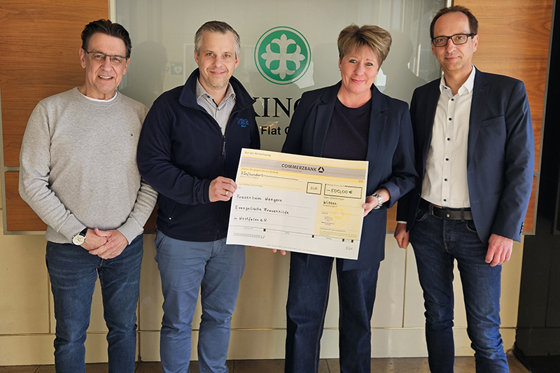 Mitarbeitende im Wittener Werk der Pilkington Automotive Deutschland GmbH machten sich Gedanken um eine Spende für das FRAUENHEIM WENGERN. Die Aktionen der Einrichtung rund um den Weltfrauentag und das Interesse des Werkes, im nahen Umfeld zu bleiben, führten auch 2025 zu dieser Entscheidung. So trafen sich Nadine Somer, Gesamtleiterin des FRAUENHEIM WENGERN, mit Betriebsratsmitglied Wolfgang Ritter, Werkleiter Werk Witten Fabian Wirtz, und Wolfgang Endemann, Geschäftsführer Pilkington Automotive Deutschland GmbH, Anfang April.