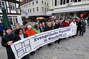 Mit Trillerpfeifen und Sprechchören beteiligte sich eine große Gruppe aus der Evangelischen Frauenhilfe in Westfalen e.V. Anfang Mai an der Demonstration gegen „Pro NRW“ in Soest. Mitarbeiterinnen und Mitarbeiter, Gäste der Tagungsstätte Soest und Schülerinnen und Schüler des Fachseminars für Altenpflege waren dem Aufruf der Frauenhilfe gefolgt, sich an der Demonstration gegen die vom Verfassungsschutz beobachtete Partei zu beteiligen. Der Vorstand der Evangelischen Frauenhilfe in Westfalen e.V. hatte im letzten Jahr einen Wahlaufruf veröffentlicht, in dem er deutlich gemacht hatte, dass rechtsextreme Parteien für Christinnen und Christen nicht wählbar seien. |