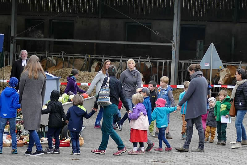 Im Anschluss gab es Erbsensuppe, Würstchen, Kaffee und Kuchen sowie eine Versteigerung von Erntegaben. Zwischen Gottesdienst, Mittagessen und Versteigerung vertrieben sich Eltern und Kinder die Zeit, schauten Kühe und Schweine an, was für viele etwas Besonderes ist. Die gute Stimmung nahm durch das wechselnde Wetter keinen Schaden.
