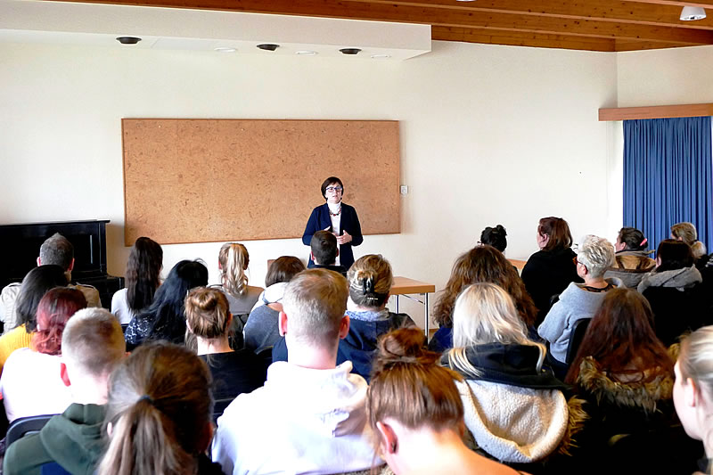 Fast 70 Menschen, in der Mehrzahl Auszubildende in der Altenpflege, stellten ihr kritische Fragen zum Konzept der Generalistischen Pflegeausbildung, zum Image der Altenpflege, zur Entlohnung, zur Anwerbung von Fachkräften aus dem Ausland und zur Finanzierung von Pflege im Allgemeinen. Zum Schluss versprach sie, im nächsten Jahr sich den Fragen wieder zu stellen und zu erklären, was zwischenzeitlich diesbezüglich in die Wege geleitet worden sei.