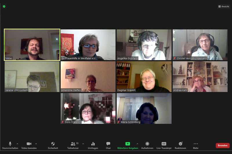 Aufgrund der Corona-Pandemie konnte das Modul nicht in Präsenzform stattfinden. Daher haben sich die Verantwortlichen von der Evangelischen Frauenhilfe in Westfalen und der Evangelischen Bildungsstätte für Diakonie und Gemeinde Bethel ein besonderes Format überlegt. Die Kursunterlagen wurden zugeschickt und im eigenen Rhythmus bearbeitet. Im digitalen Raum via Zoom fanden vier 2stündige Treffen zum Austausch im 2-Tage Abstand abends statt. Zudem wurden 2er Teams gebildet, um sich in besonderer Weise durch den Kurs zu begleiten.