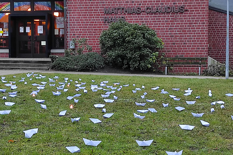 Die Frauenhilfe in Münster-Albachten hat mit Unterstützung einiger Jugendlicher aus der Gemeinde vor dem Matthias-Claudius-Haus den Verstorbenen im Mittelmeer gedacht.