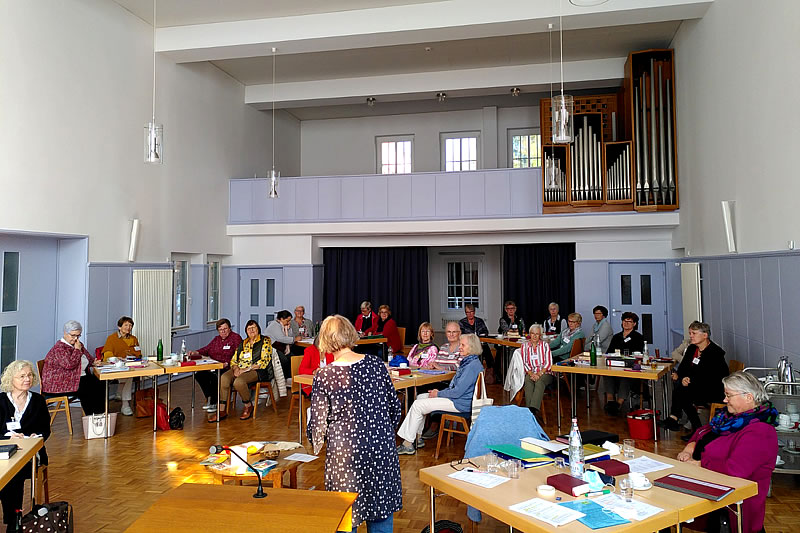 Die Frauen hatten sich im Laufe der letzten 18 Monate für das Leiten einer gemeindlichen Frauenhilfegruppe in Altena, Bad Sassendorf, Bielefeld, Bochum, Dortmund,Greven, Hamm, Hille, Höxter, Kamen, Lippetal, Lüdenscheid, Medebach, Metelen und Welver entschieden. Zu Beginn erwartete sie ein Interview – die Vorsitzende Angelika Waldheuer stellte sich den Fragen der Verbandsreferentinnen Lindtraut Belthle-Drury und Claudia Montanus. Durch Fragen wie: „Sie sind seit 2019 Vorsitzende. Was begeistert Sie an Frauenhilfe?“ und „Seit wann gibt es eigentlich Frauenhilfe? Wo hat diese Organisation Ihren Ursprung“ erhielten die Gruppenleiterinnen kurzweilig und authentisch einen Eindruck von der vielfältigen Arbeit der EFHiW, seiner Struktur und von den Arbeitsbereichen. Und vor allem: Frauenhilfe mit Herz und Verstand macht Spaß und bewegt etwas!