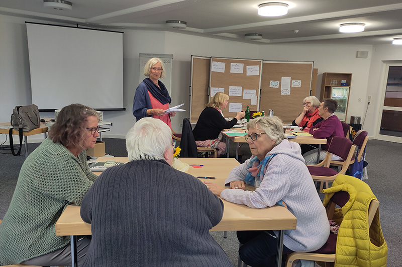 Es wurde viel gelacht und mit Freude ausprobiert. Am Ende qualmten die Köpfe, aber alle waren zufrieden. Der ein oder andere Änderungswunsch wurde genannt und eine neue Struktur beim Materialheft mitbedacht. Nun werden die beiden Referentinnen das Material finalisieren. Dann kann es sich in 2025 wieder in vielfacher Weise bewähren.