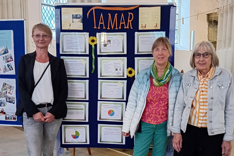Die Beratungsstelle TAMAR wird durch Rosi Kubacki, Vorsitzende des Bezirksverband Steinfurt-Ahaus der Evangelische Frauenhilfe, und Conny Weseloh präsentiert. Beraterin Jolanta Schmidt war bei der Vernissage der Ausstellung am 30. Juni dabei.