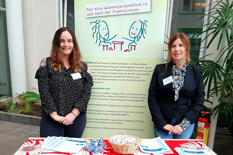 Neben der konkreten Unterstützung der Klientinnen spielt auch die Vernetzung eine große Rolle. Das fängt schon damit an, dass sich THEODORA Büroräume mit NADESCHDA, der Frauenberatungsstelle für Betroffene von Menschenhandel, teilt. Intensive Kontaktpflege gab es auch 2024 mit den Ordnungs- und Gesundheitsämtern in OWL. Beim Runden Tisch „Internationaler Menschenhandel und Prostitution“ tauschten sich über 55 Fachleute aus Behörden, Polizei und Beratungsstellen aus, um Schutz und Unterstützung für Betroffene zu verbessern. Zudem positionierte sich die Beratungsstelle zusammen mit dem Bündnis der Fachberatungsstellen für Sexarbeiter*innen (BUFAS e.V.) und ihrer Trägerin, der Evangelischen Frauenhilfe in Westfalen e.V., klar gegen ein Sexkaufverbot. „Nur durch Unterstützung statt Kriminalisierung können die Lebensbedingungen von Sexarbeiterinnen verbessert werden“, betont die Beraterin Elisa Meyer.