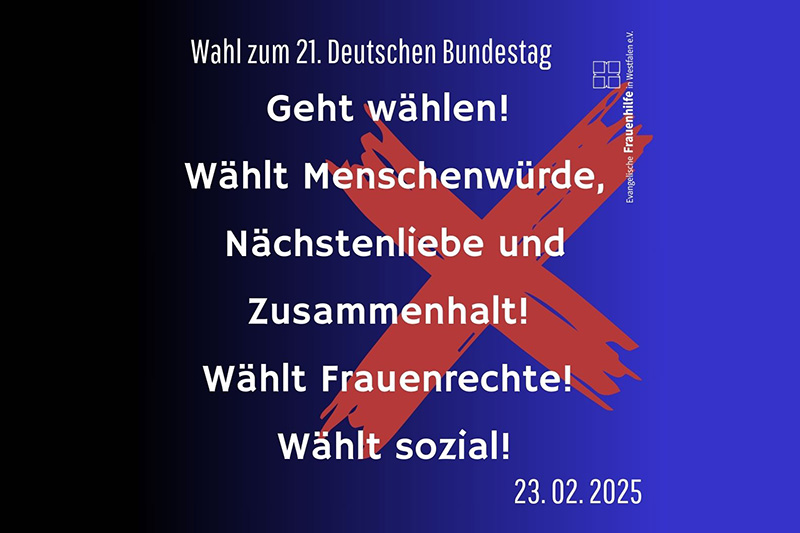 Am 23. Februar sind Bundestagswahlen in Deutschland. Die Evangelische Frauenhilfe in Westfalen e.V. (EFHiW) schließt sich einer breiten ökumenische Initiative an, die dazu die Stimme der Kirchen nach außen hör- und sichtbar macht. Mit ihr setzt sie sich gemeinsam ein für Menschenwürde, Nächstenliebe und Zusammenhalt. Sie setzen sich ein für Demokratie und gegen Extremismus. Sie setzen sich ein, dass Denken und Handeln auf das Wohl aller Menschen in der deutschen Einwanderungsgesellschaft hin ausgerichtet sind.