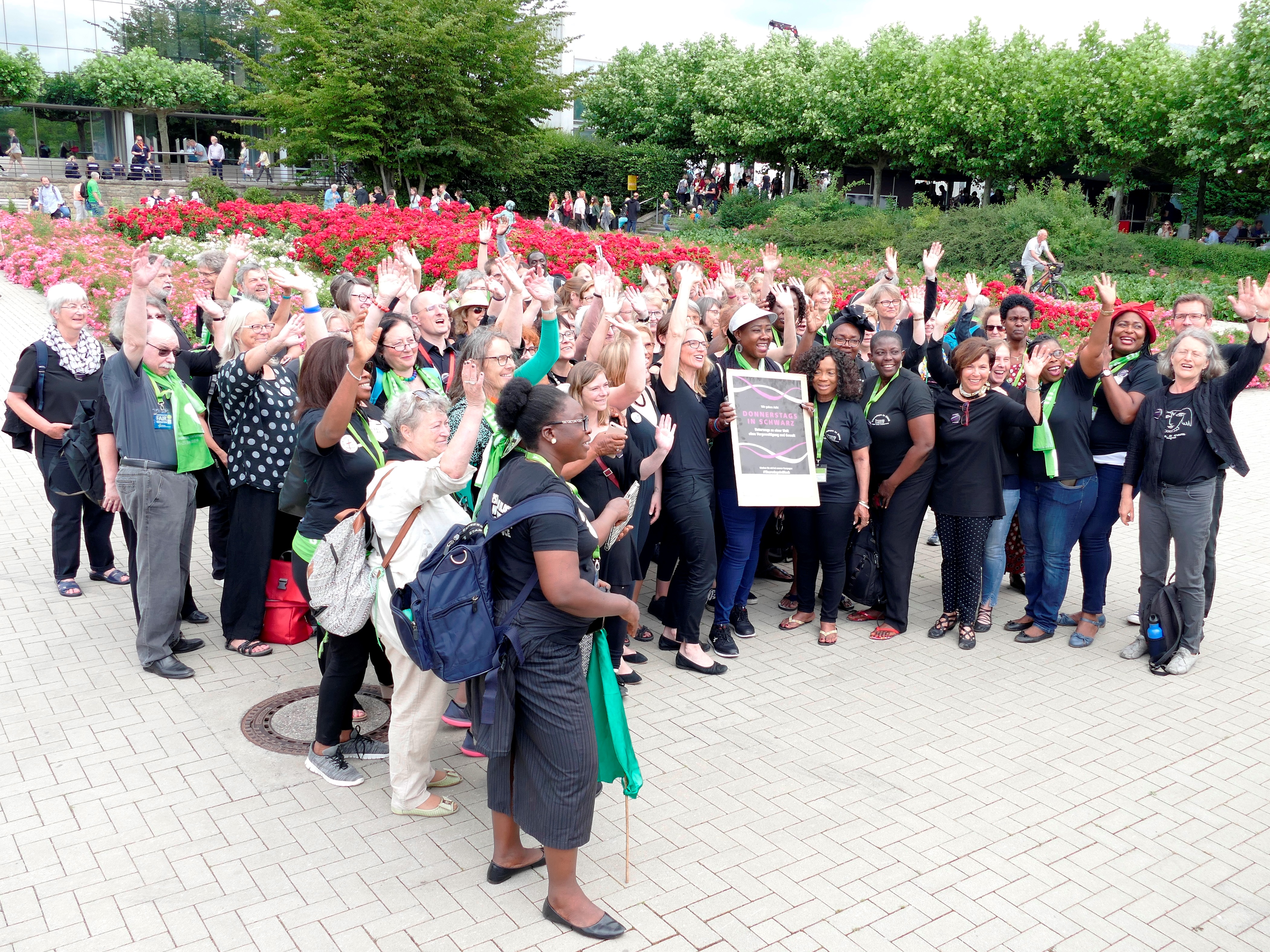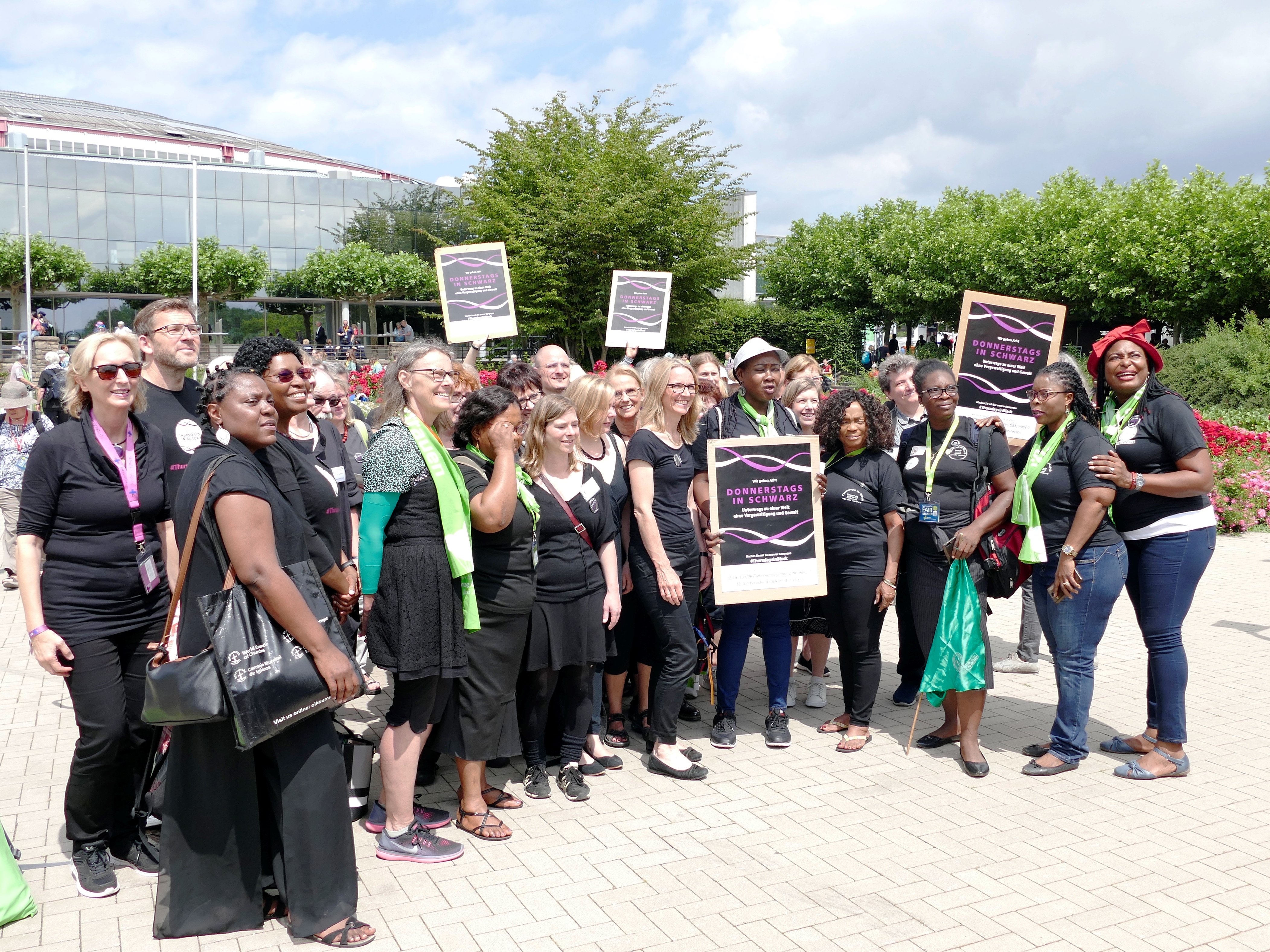 Für ein Ende von Vergewaltigung und Gewalt Mehr als 100 Frauen in schwarzer Kleidung mit Button versammelten sich heute zum Fototermin an den Rosenterrassen. Sie setzen ein Zeichen als Botschafterinnen für Respekt, Sicherheit und Gerechtigkeit. Das ist das Ziel der globalen ökumenischen Kampagne "Donnerstag in Schwarz"! Und als weltweites Problem war die Gruppe auch international zusammengesetzt, und ordnete sich immer wieder neu zusammen. |