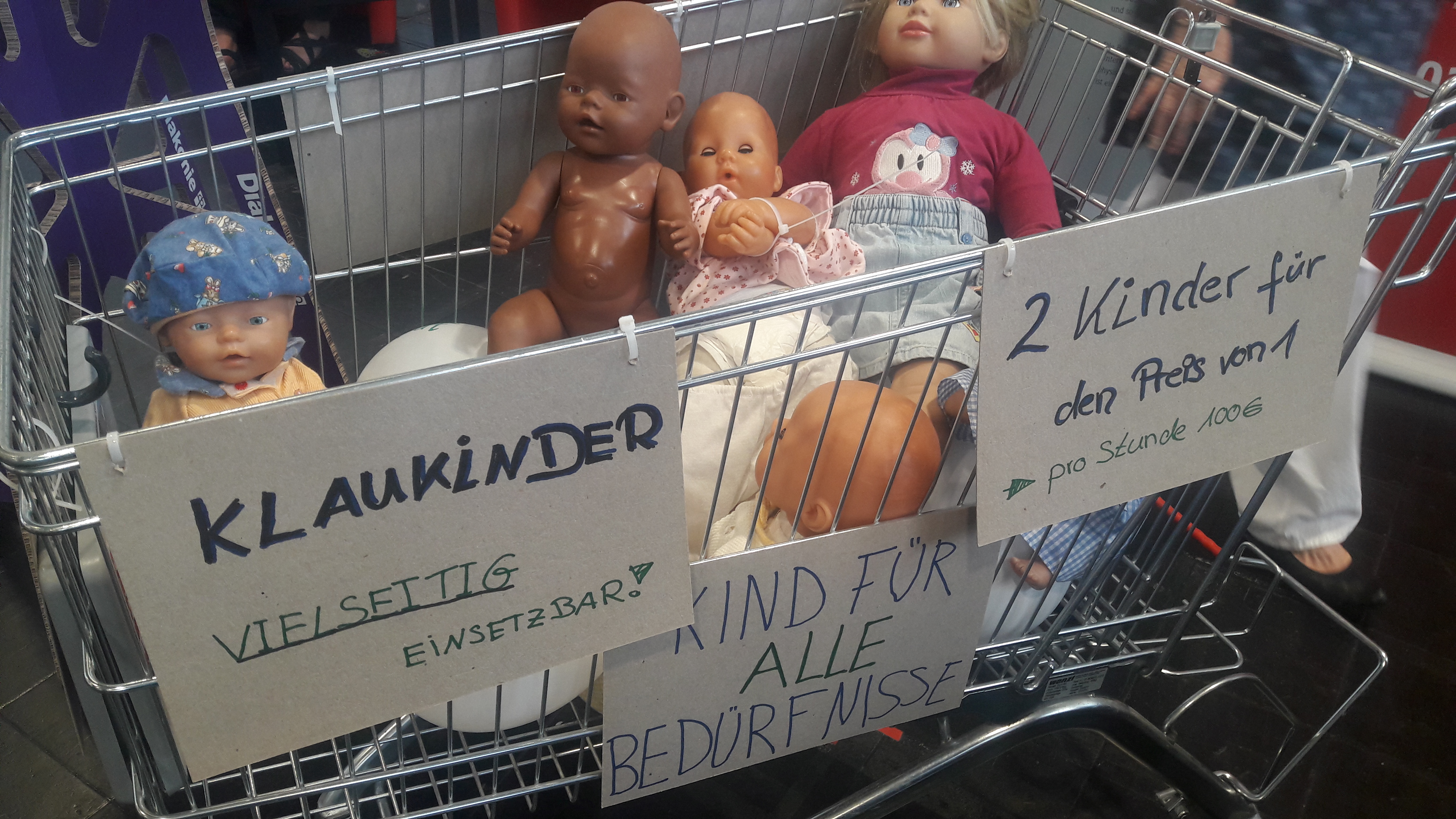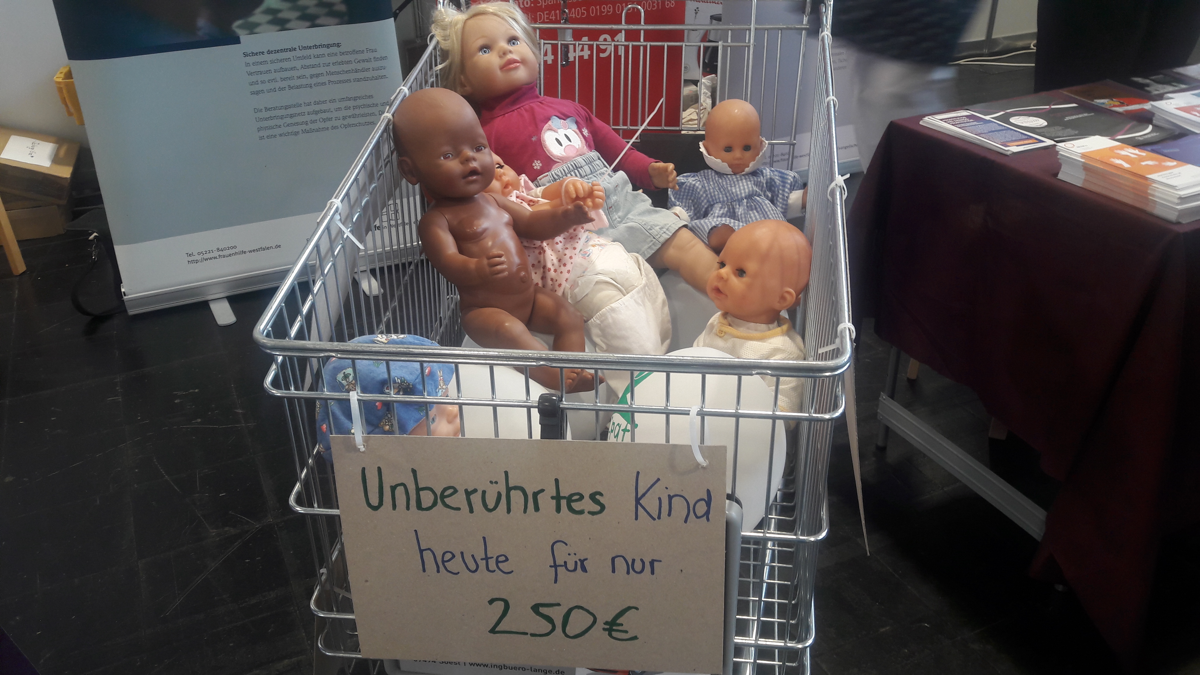 Unberührtes Kind - heute für nur 250 Euro Kind für alle Bedürfnisse. Klaukinder vielseitig einsetzbar. 2 Kinder für den Preis von 1 Mit diesen Schildern am Einkaufswagen bleiben viele Kirchentagsbesucher*innen erschrocken stehen. So kommen wir ins Gespräch über Kinderprostitution und Kinderhandel und was da hinter steckt. Wir sind in Halle 4 anzutreffen. |